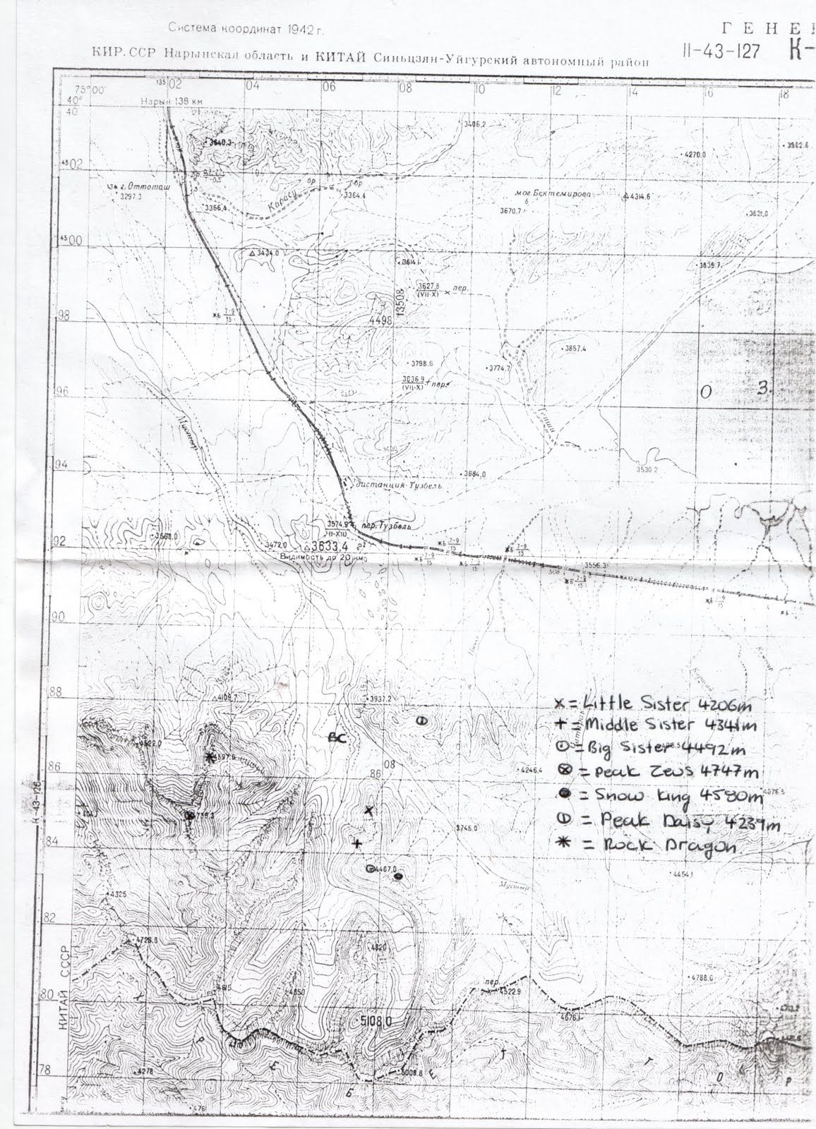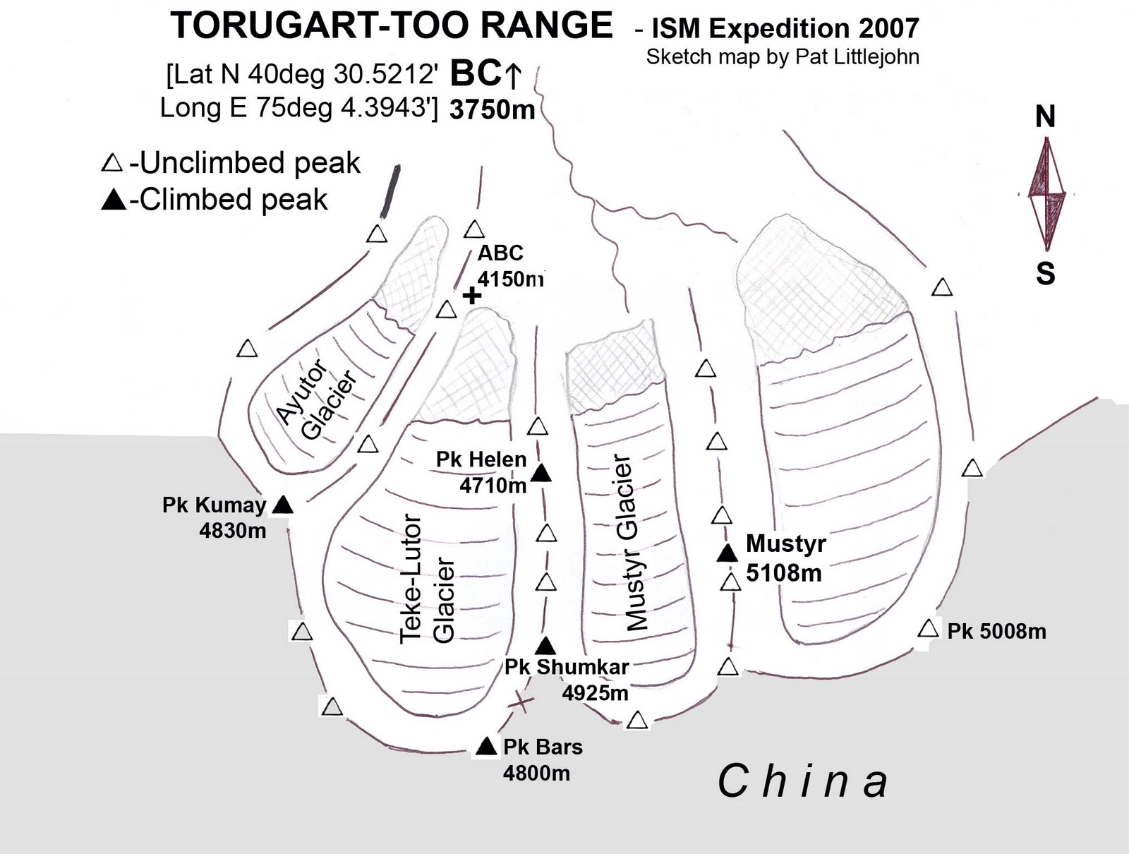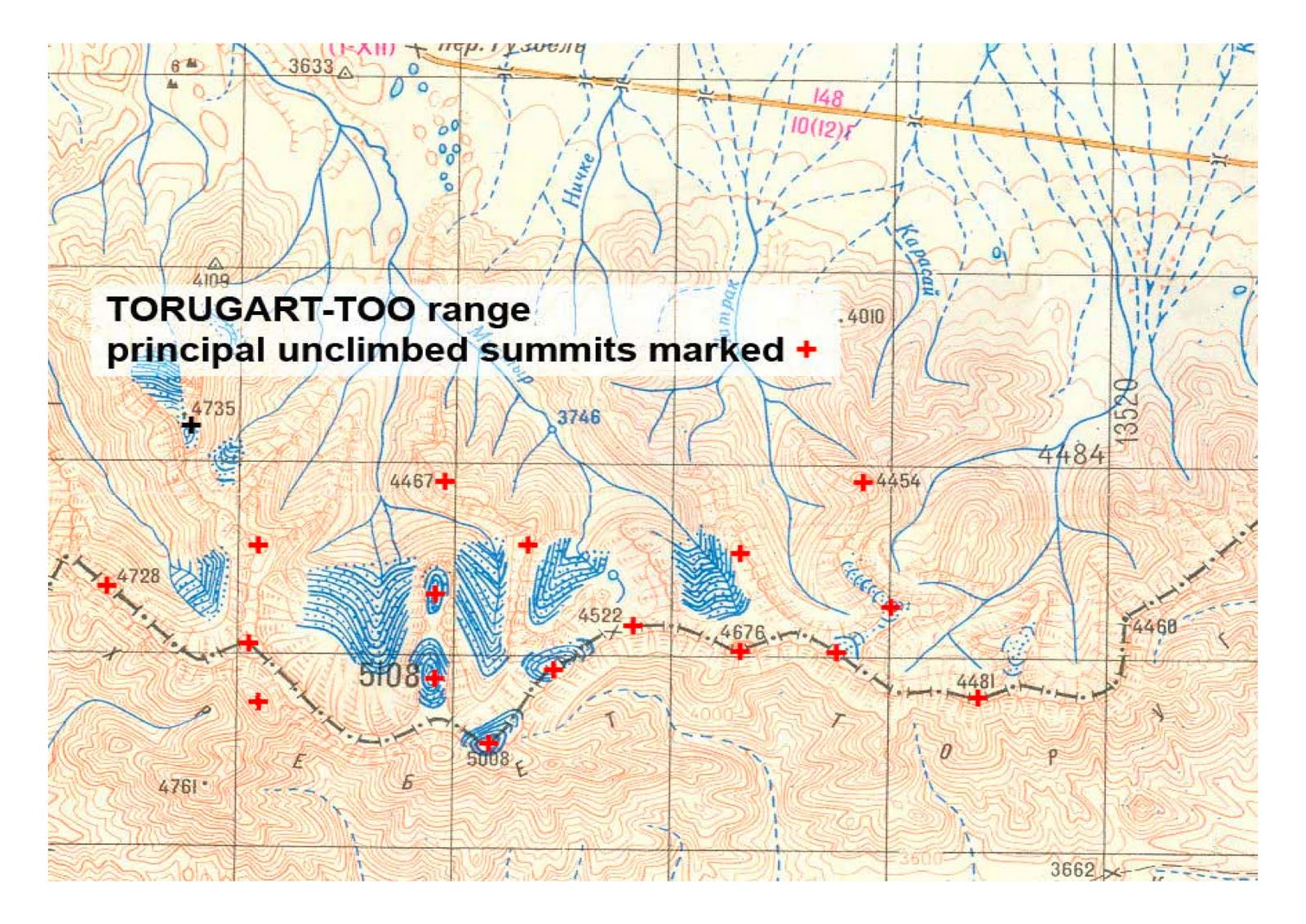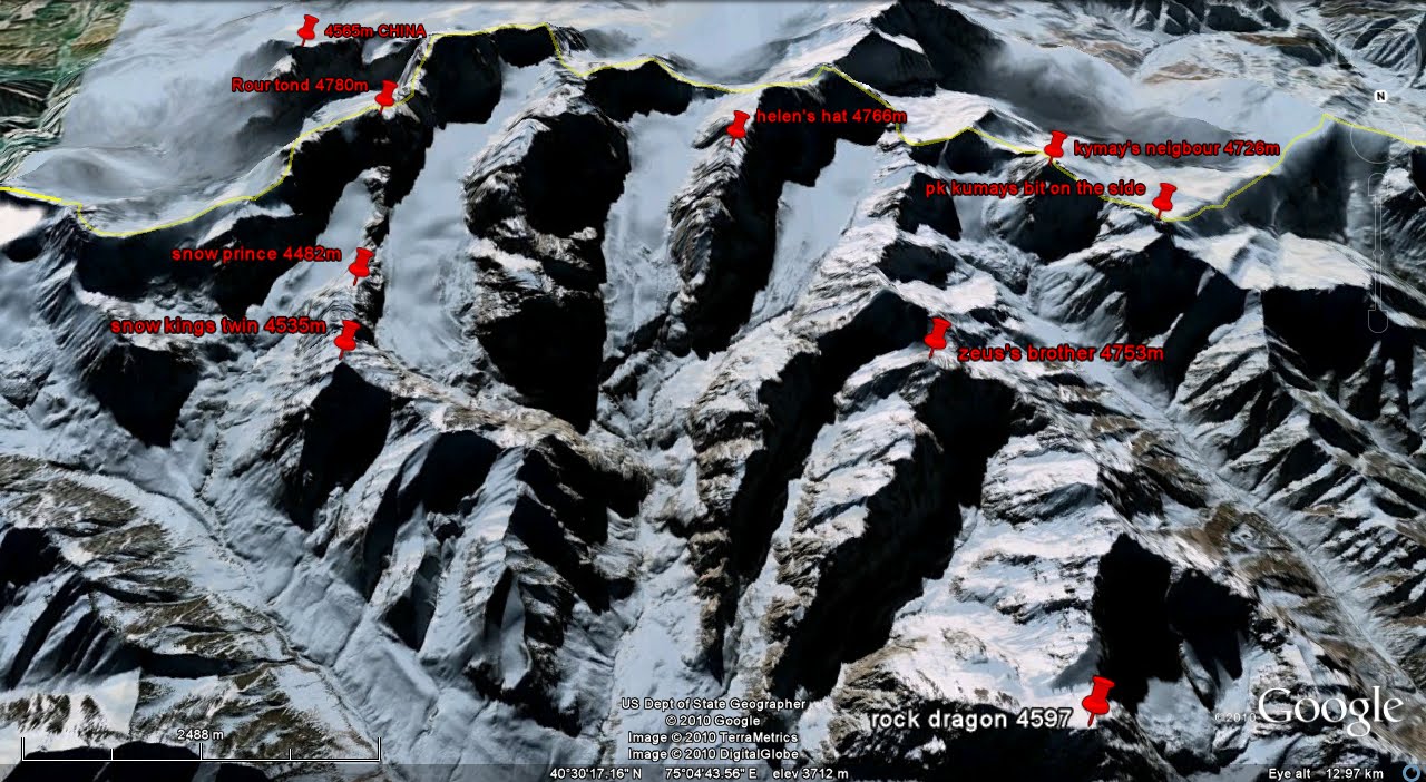 The unclimbed and un-named Pt 5008m is one of our objectives, This map is now out dated and a far few of the summits on the western side have been climbed by an ISM expedition in 2007 and a greek / english pare in ??