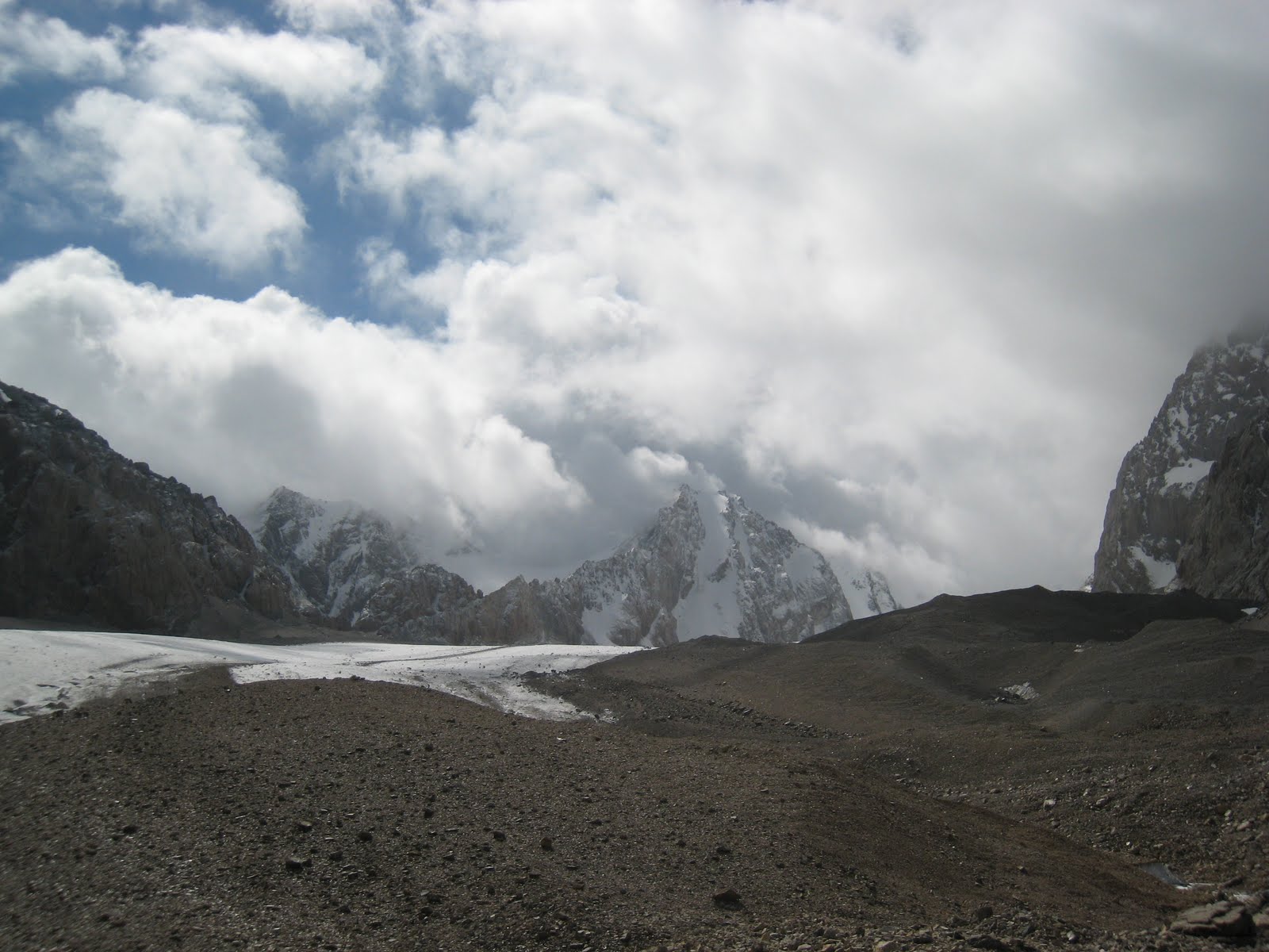 Weather is Bishkek is warm ~20-24 C during the day always Sunny no rain. In the mountain it is ~20C during a sunny day 15-17C on a cloudy overcast day and~ 7C at night. (these temps are ~ value for basecamp @ about 3800 meters) Each day usually it rains low and may snow at higher elevations. Weather usually rolls in each day around 2-3 and hangs around till 6-7 with scattered showers rolling through for 5-15 min at a time. The pattern usually at higher elevations was clear day, overcast for 2-3 days with the afternoon rolling showers followed by one long day of snow all day then a day or two clear, and repeat.