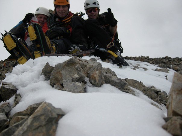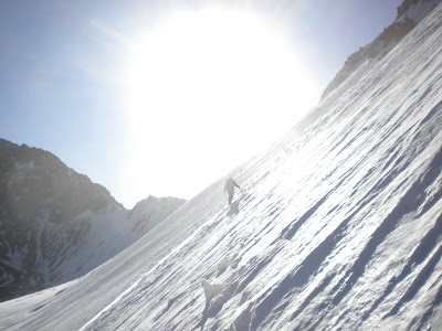 I was in a sleep deeper than dreaming, when toms movement roused me; he announced ‘it’s 5.30: we have slept through the alarm’ The weather outside was grey but seemed stable, after some debate we decided upon tentatively going and if the weather worsened then it would still be a useful reconnaissance. Kitting up at the bottom tom proclaimed ‘Im leaving this’ picking up a large bundle of slings. I set off soloing up the 300m 45degree slope, when we are reunited at the bergshrund it turns out tom was referring to his bag complete with food, water, 1st aid kit, sat phone, group shelter, sun cream, mitts, balaclava and head-torch. We only had 6 screws and no quick-draws! The weather had improved, and so I tackled the shrund and lead on-to the 65 degree slope above. To my delight the ice was alpine hard; brittle, but provided solid protection. Climbing a 60m pitch with only two runners required a bold approach. I belayed Tom and Sam up, we debated and eagerly decided to continue; Tom tackled the next pitch in fine style, it was disconcerting watching someone else climb so high with so little gear. I allowed thought of reaching the summit to enter my mind. I had previously speculated it would be 5 pitches to the summit ridge......this was an underestimation! Me and Tom continued to swap leads,